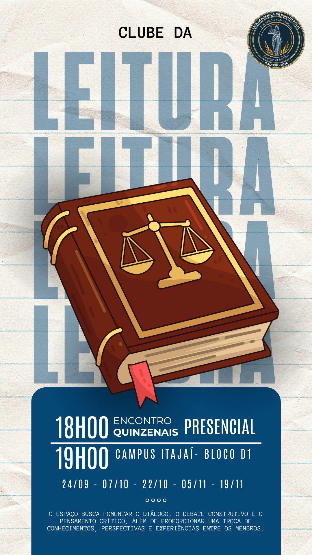 Criado para integrar os membros ligantes da Liga Acadêmica de Direito Penal e estimular o hábito da leitura, o Clube do Livro promove encontros quinzenais voltados à discussão de obras literárias e acadêmicas escolhidas pelos próprios participantes. O espaço busca fomentar o diálogo, o debate construtivo e o pensamento crítico, além de proporcionar a troca de conhecimentos, perspectivas e experiências entre os membros.