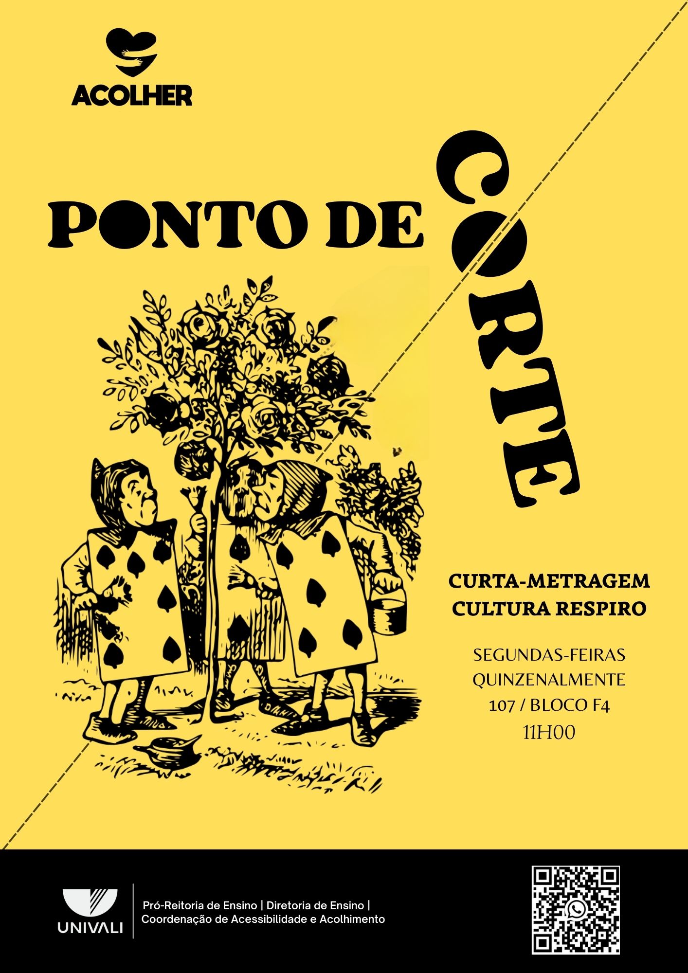 Ponto de Corte é um espaço dedicado a exibição e discussão de curtas-metragens. A proposta é debater as películas, relacionando-as através de outras áreas do saber, construindo diálogos e reflexões em grupo. Para além disso, serve como um momento de encontro, entretenimento e respiro de atividades avaliativas.